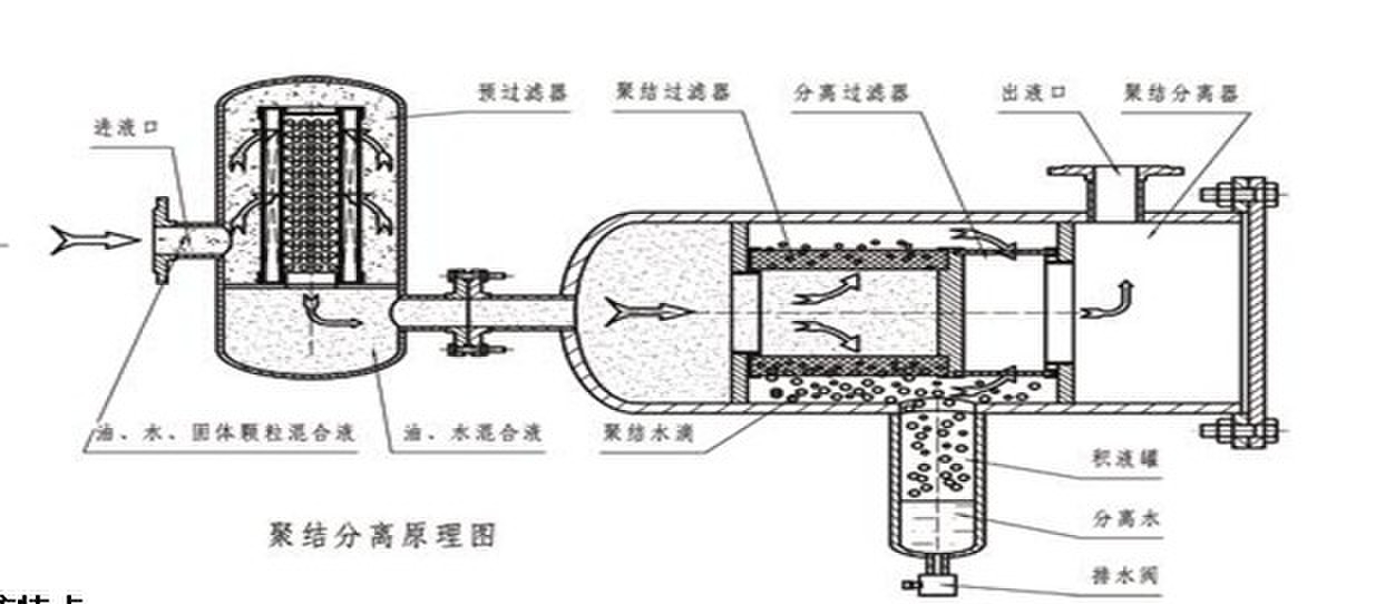 聚結(jié)系統(tǒng)由一組聚結(jié)濾芯組成,聚結(jié)濾芯采用了獨(dú)特的極性分子結(jié)構(gòu),油液中的游離水及乳化水在通過濾芯后,被聚結(jié)成較大的水滴,再依靠重力的作用下沉降至儲(chǔ)水罐內(nèi)。